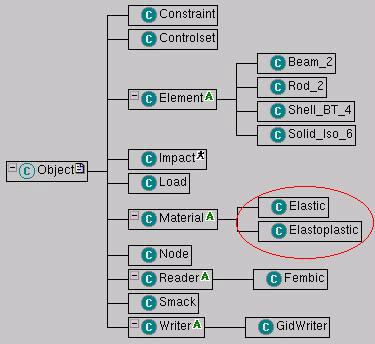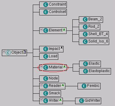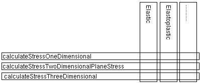 Another important class is the material class. Since there can be several different types of models for a material, this is a superclass and then there are several subclasses. Right now, there are two material models available. One for pure elastic materials and one elasto-plastic materials (materials which are elastic to a point and then acts as gum beyond that point).